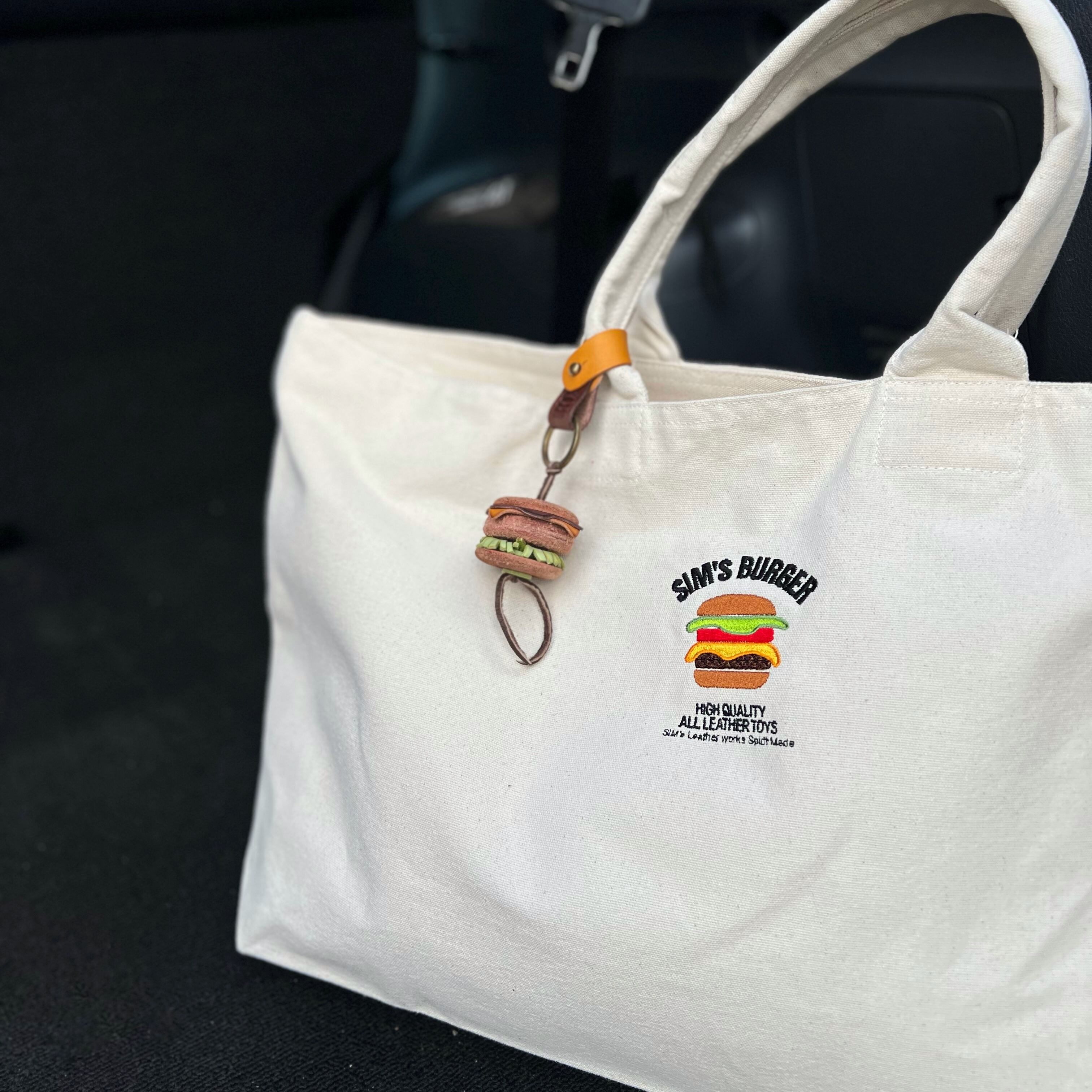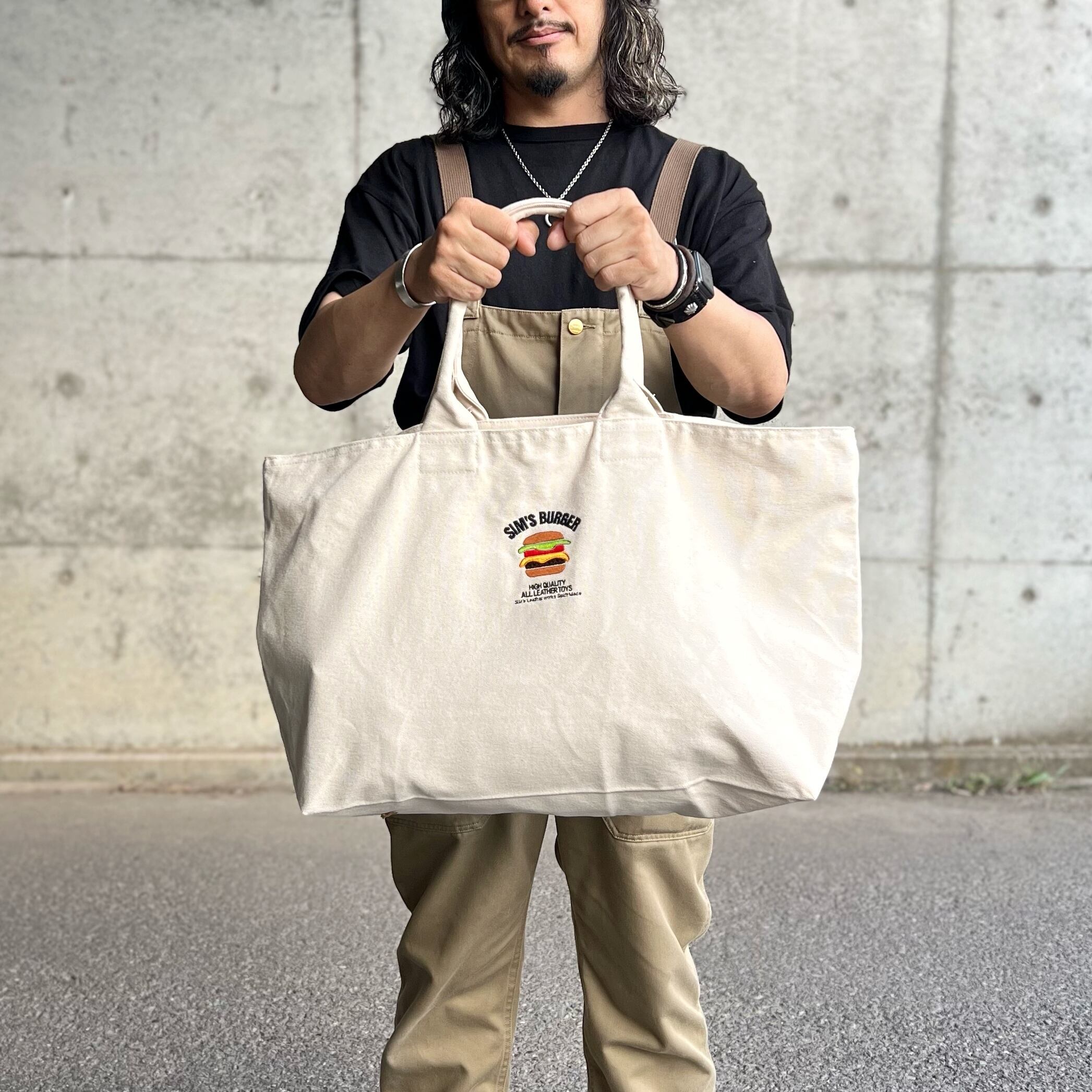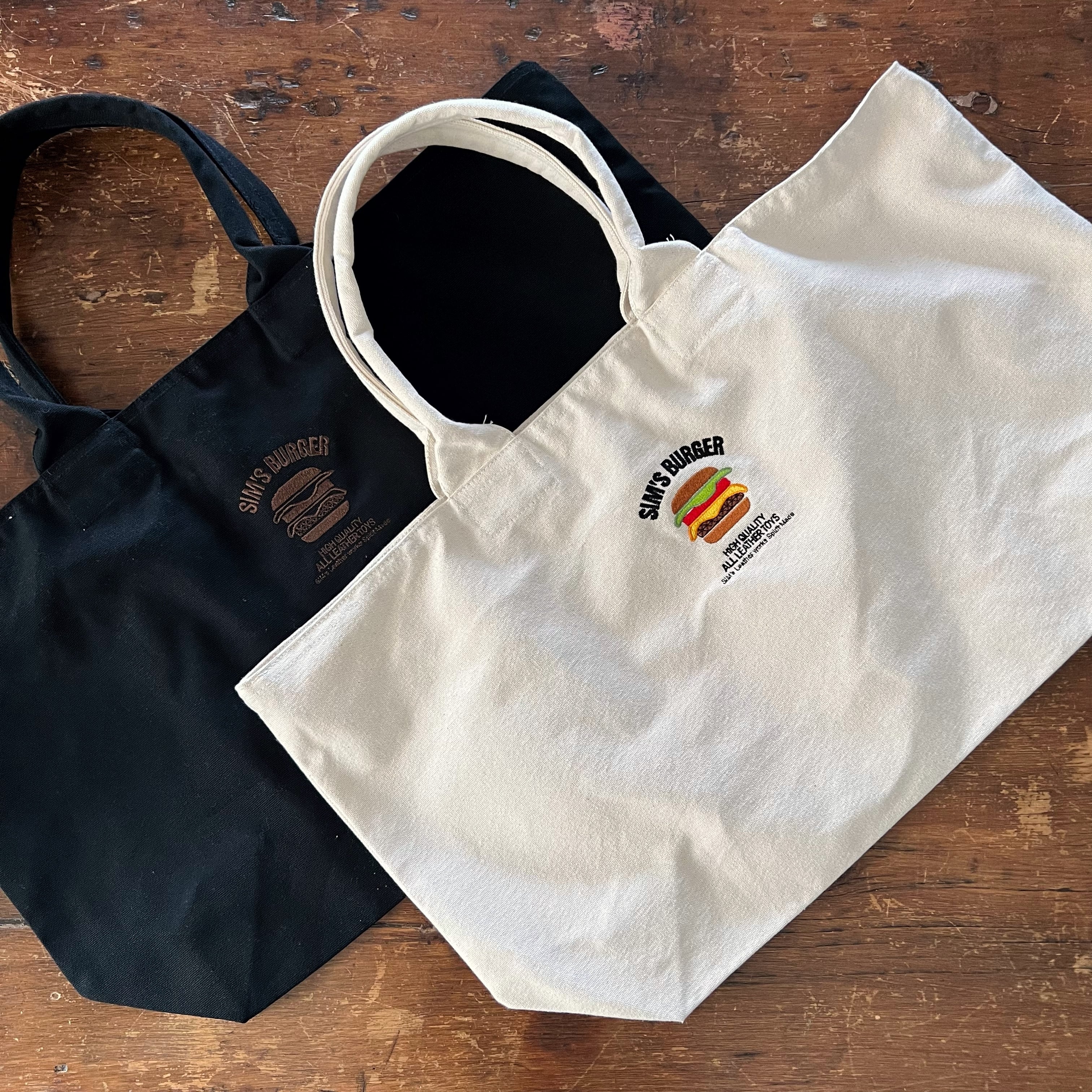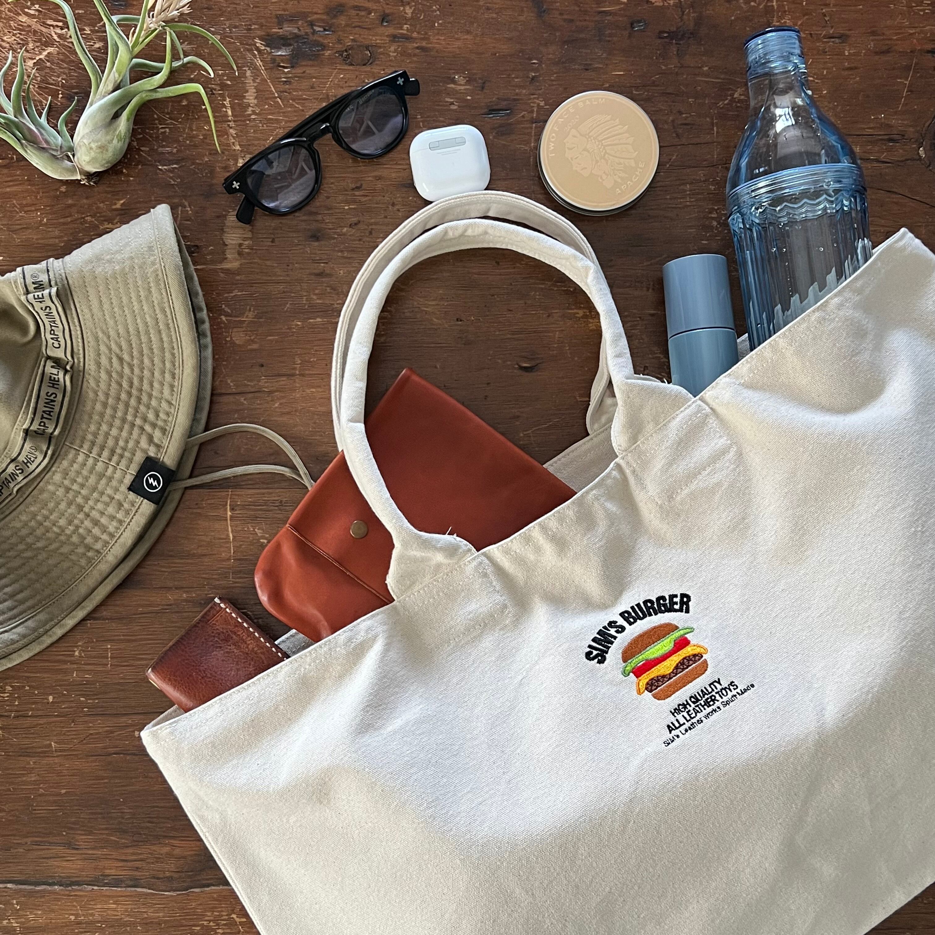 大人気SIM's Burgerのロゴを刺繍で表現した帆布のオリジナルトートバッグ。