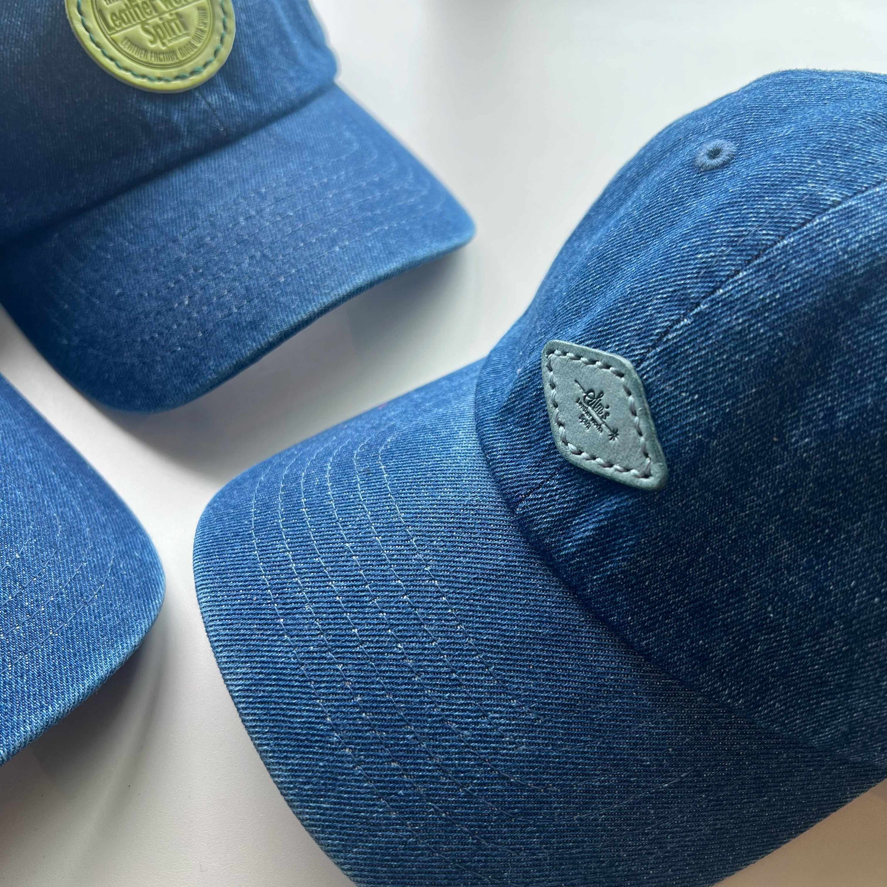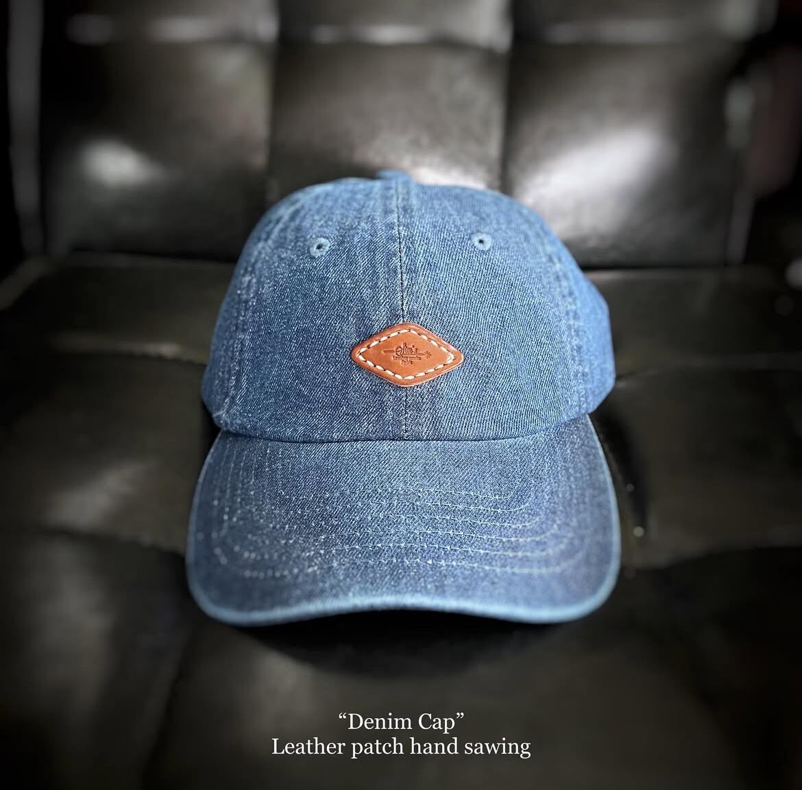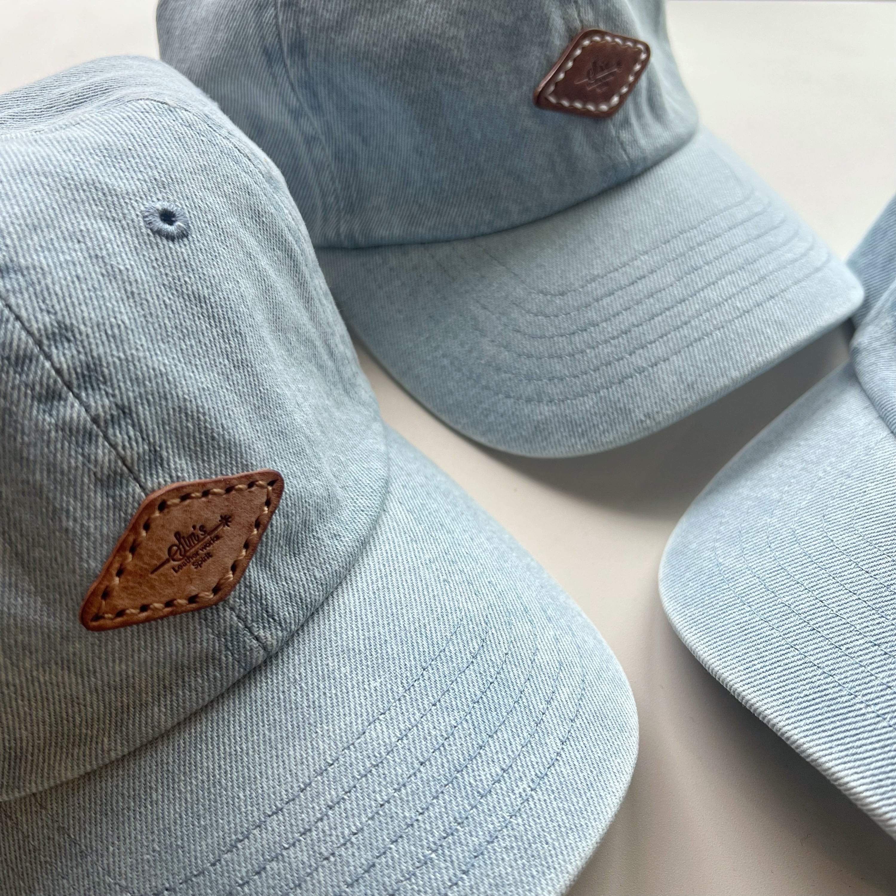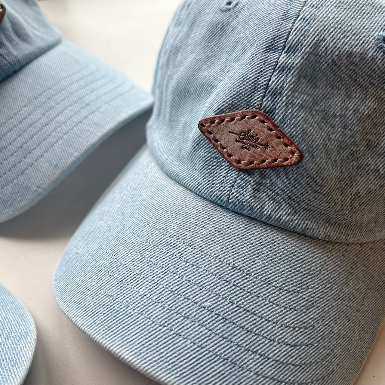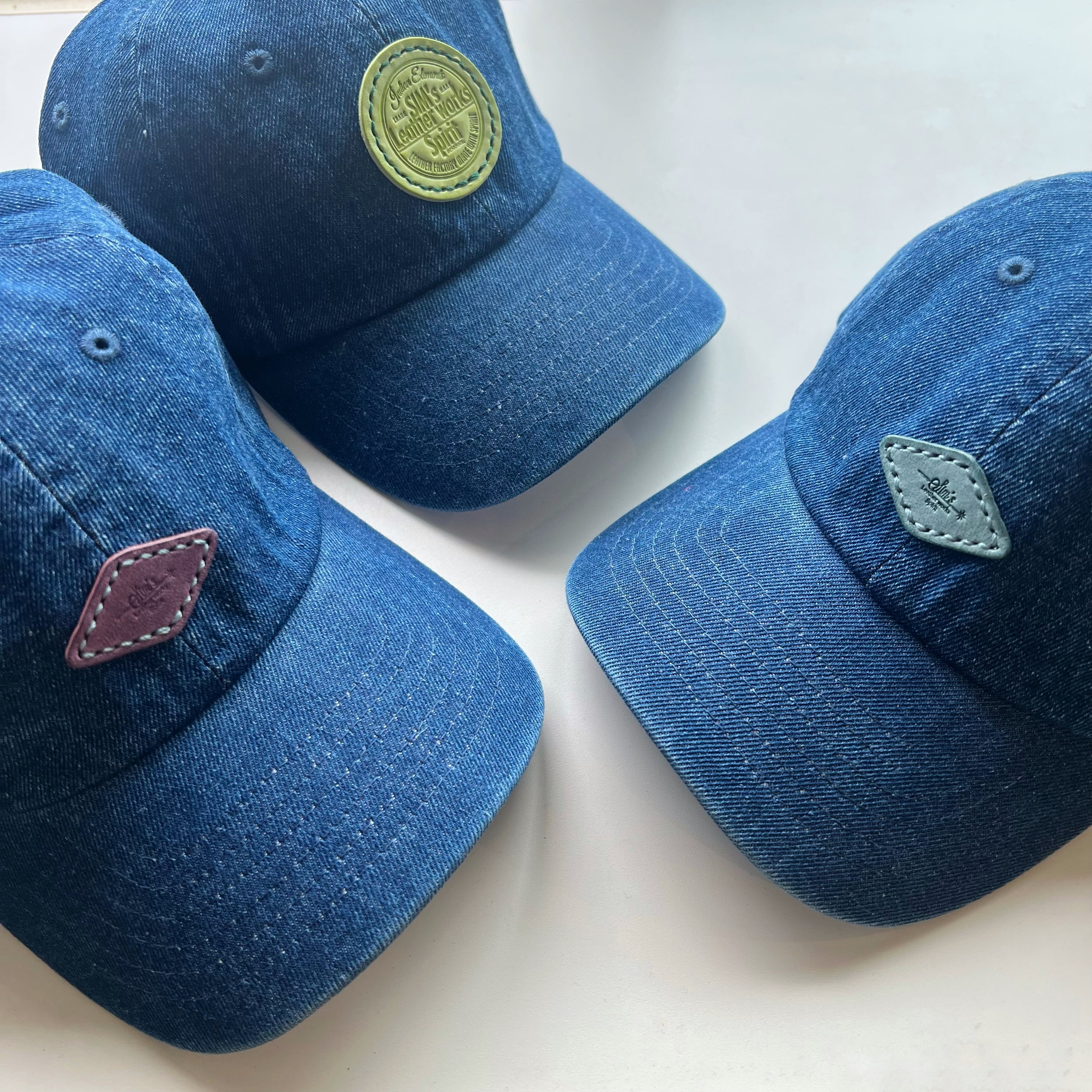 2種類のデニムキャップに、SIM'sのレザーパッチを縫いつけたオリジナルキャップ。