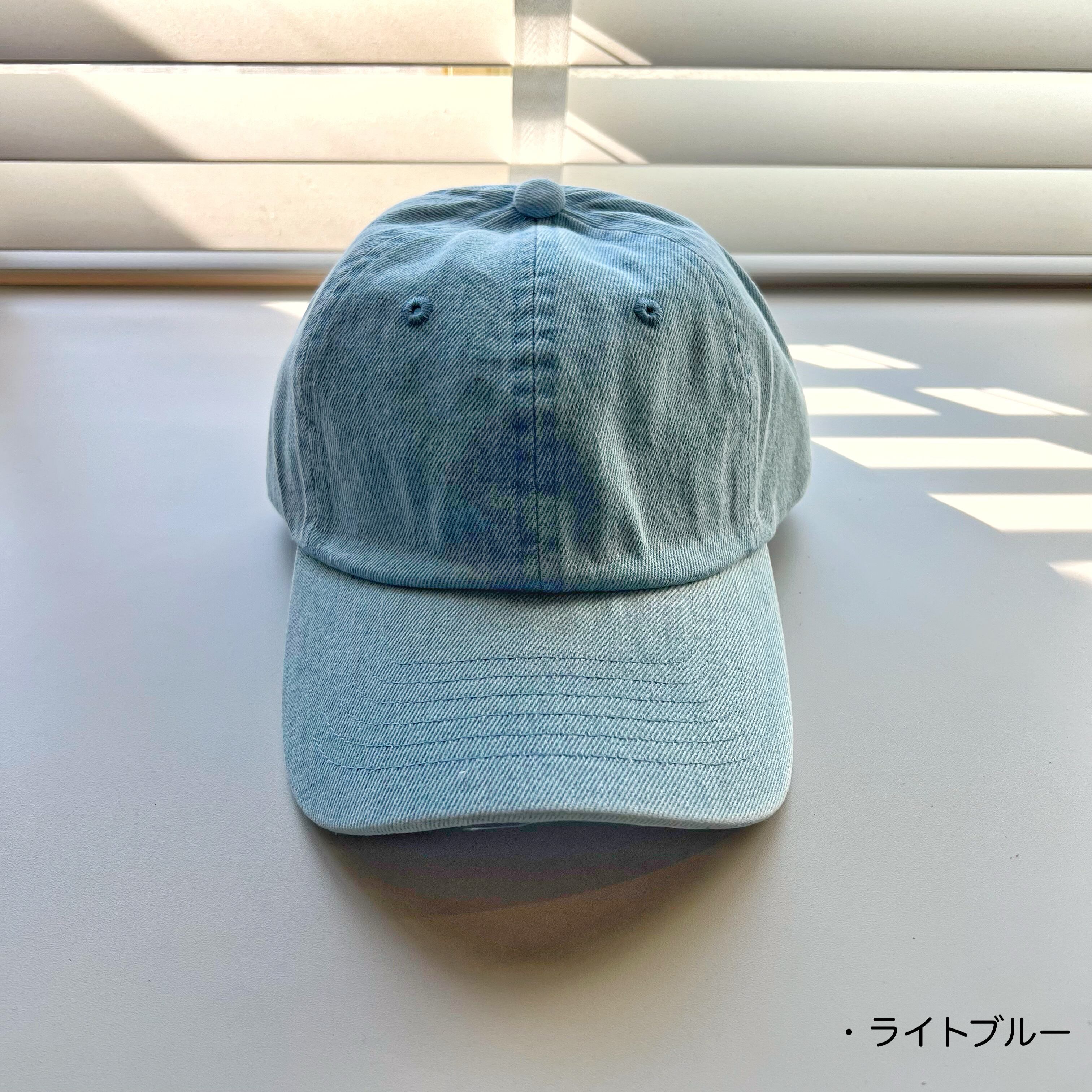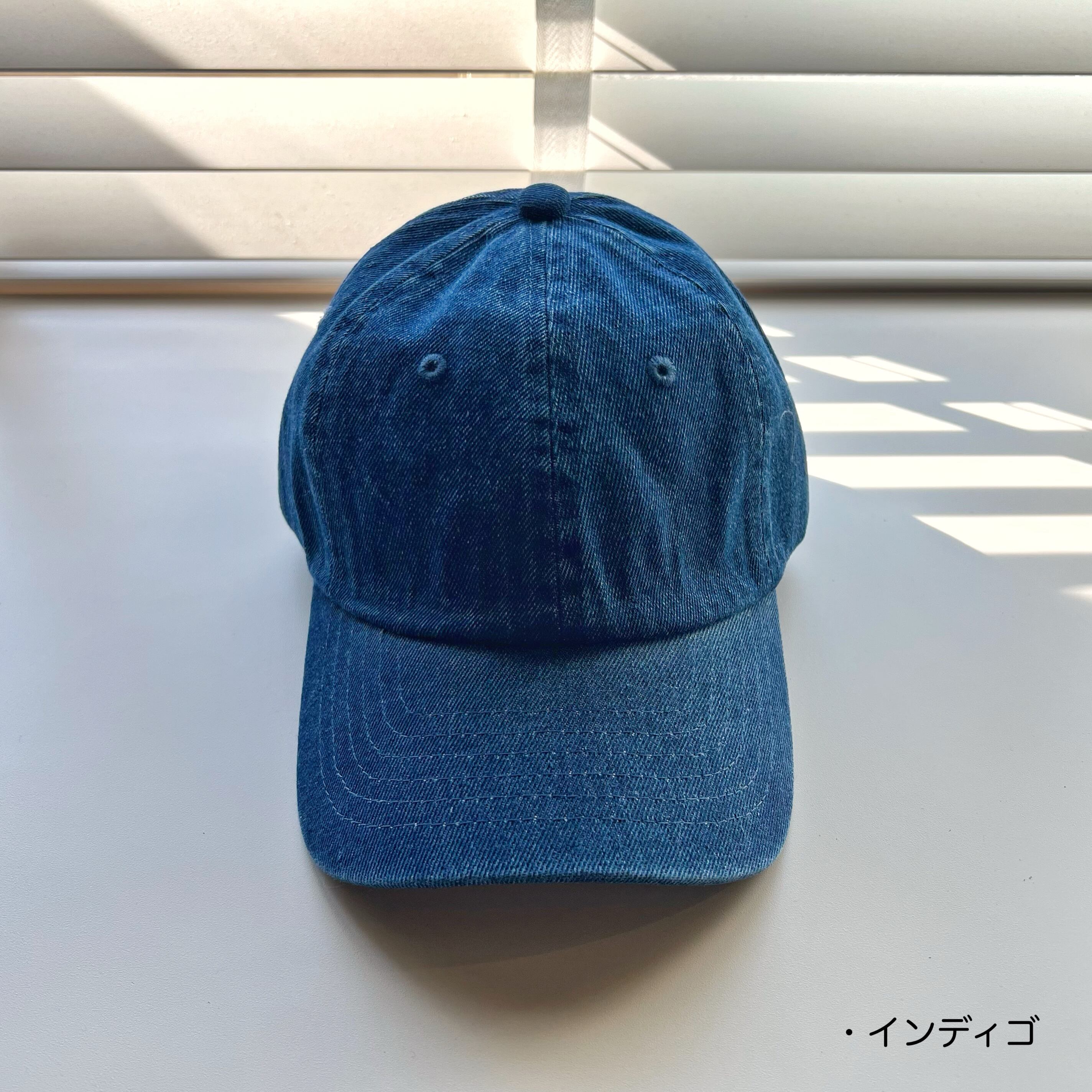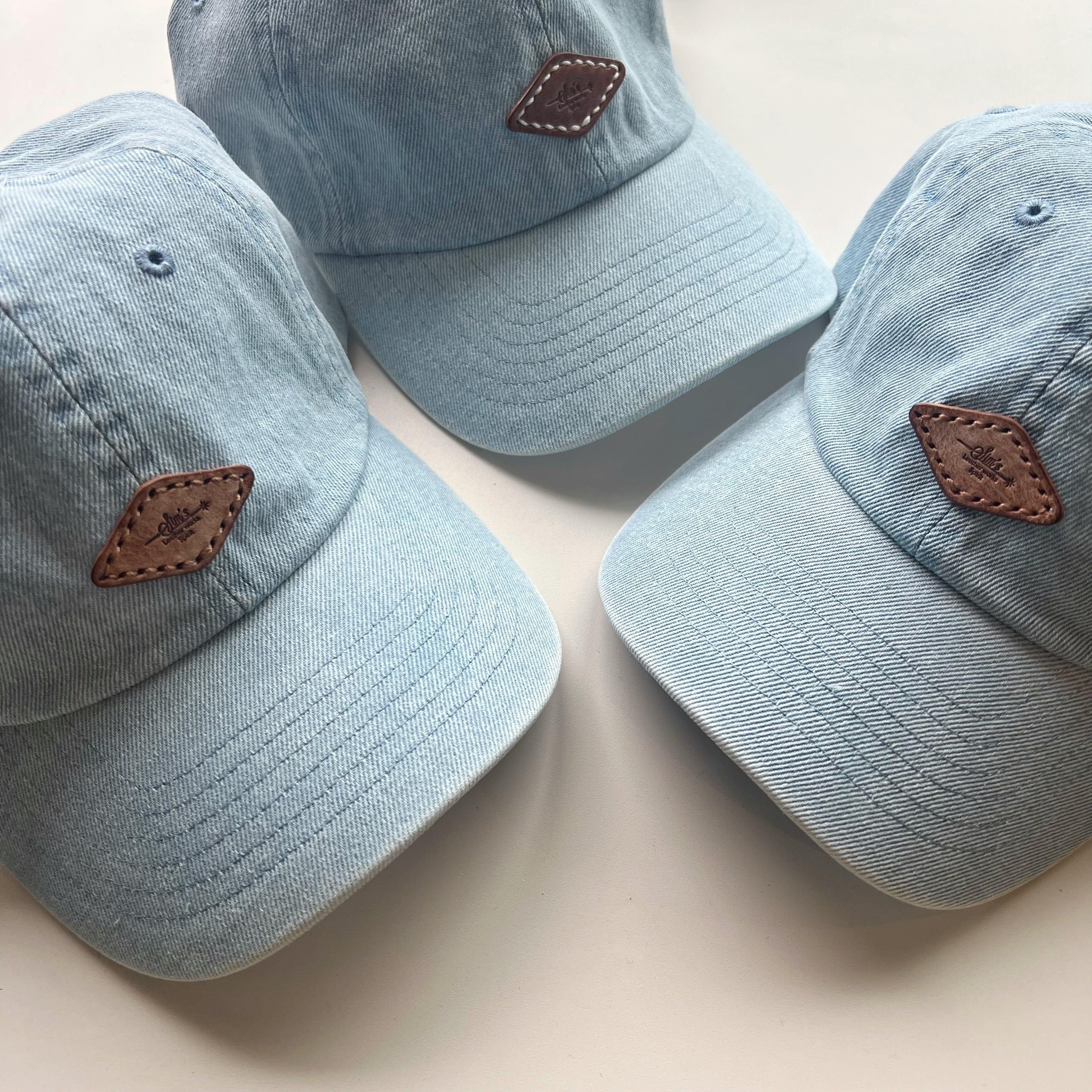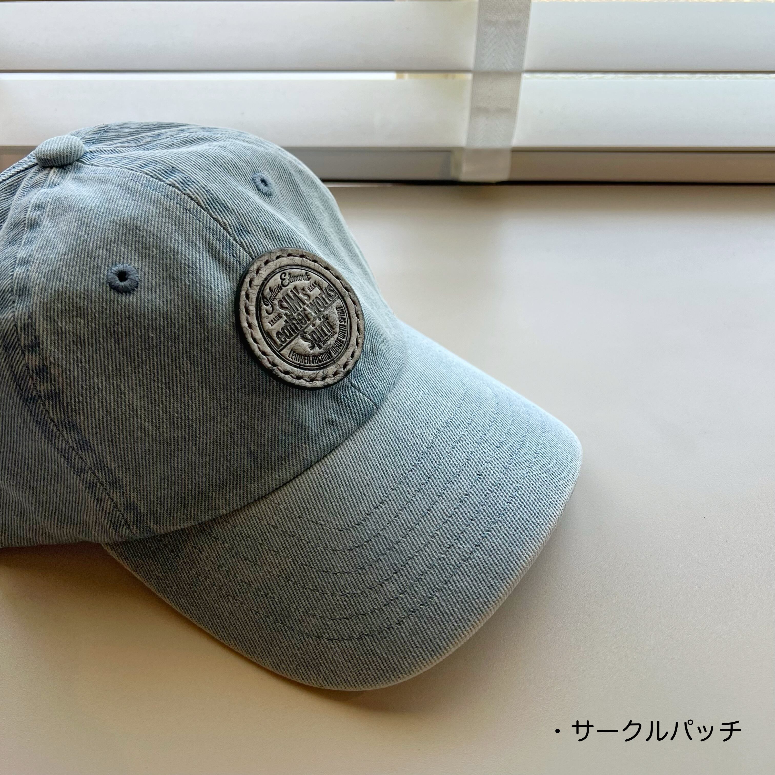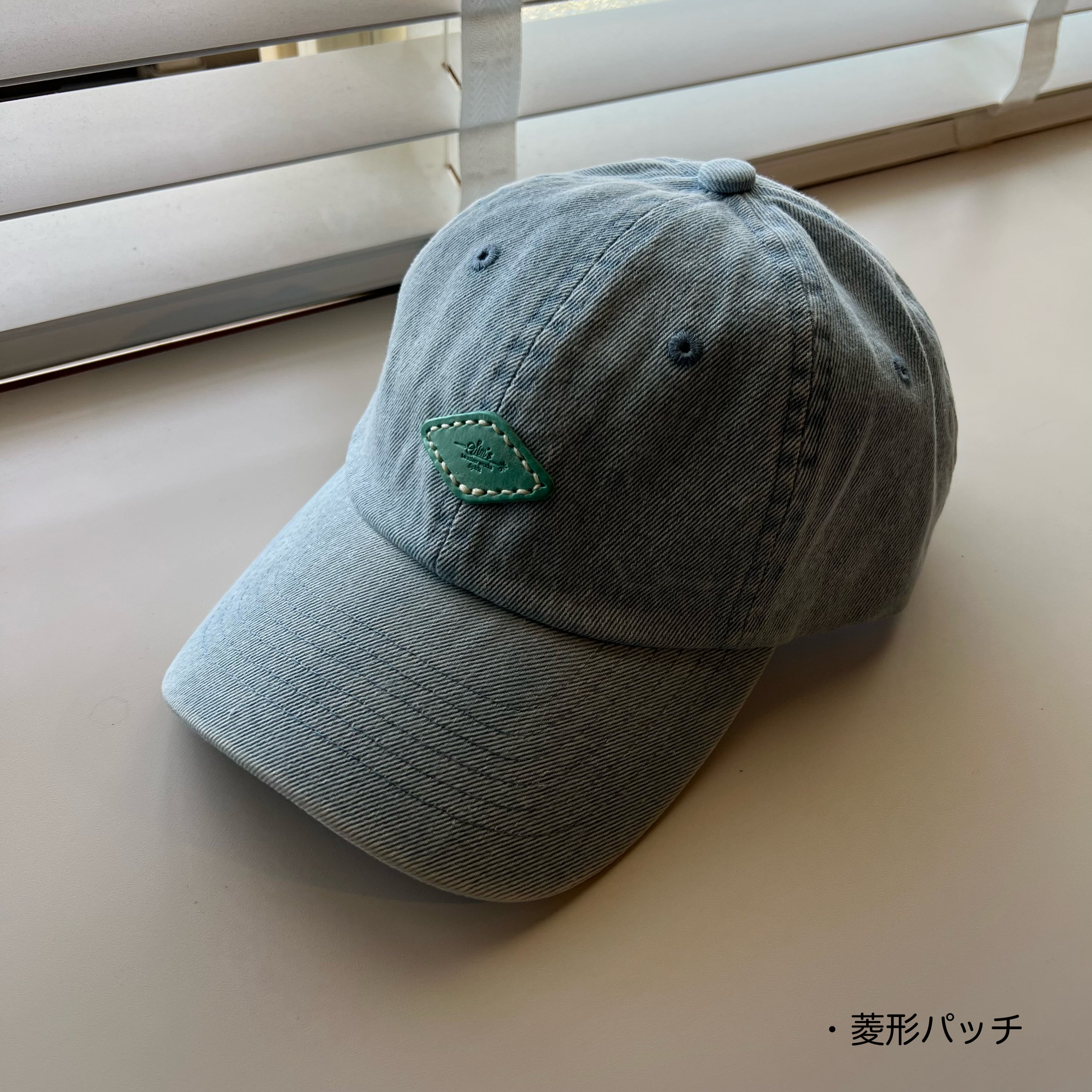 2種類のデニムキャップに、SIM'sのレザーパッチを縫いつけたオリジナルキャップ。