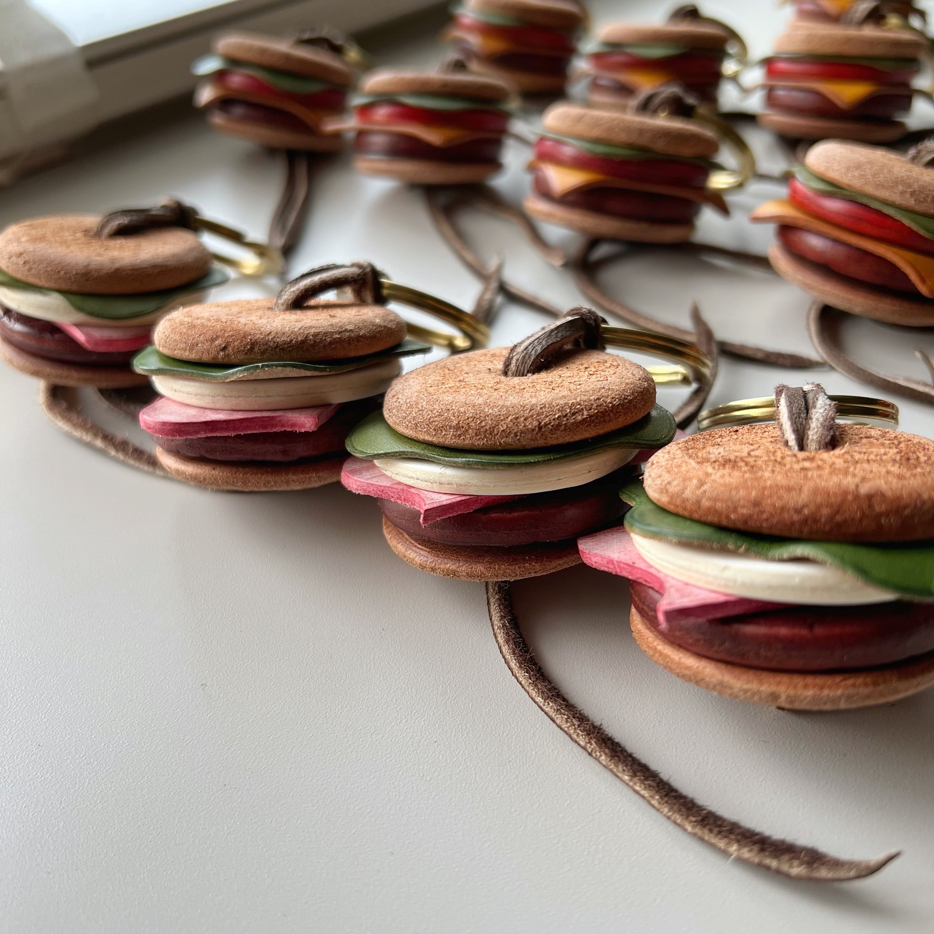 バンズは極厚6~7mmの革をサークル状に切り出して一つ一つ形を削り出しています。トマト、チーズ、パティ、レタス...etc全ての素材に拘りを詰め込んで製作しました。一つ一つに使われている革はどれも選りすぐりの高級レザーを使用しています。リアリティの中に愛らしさがあります。