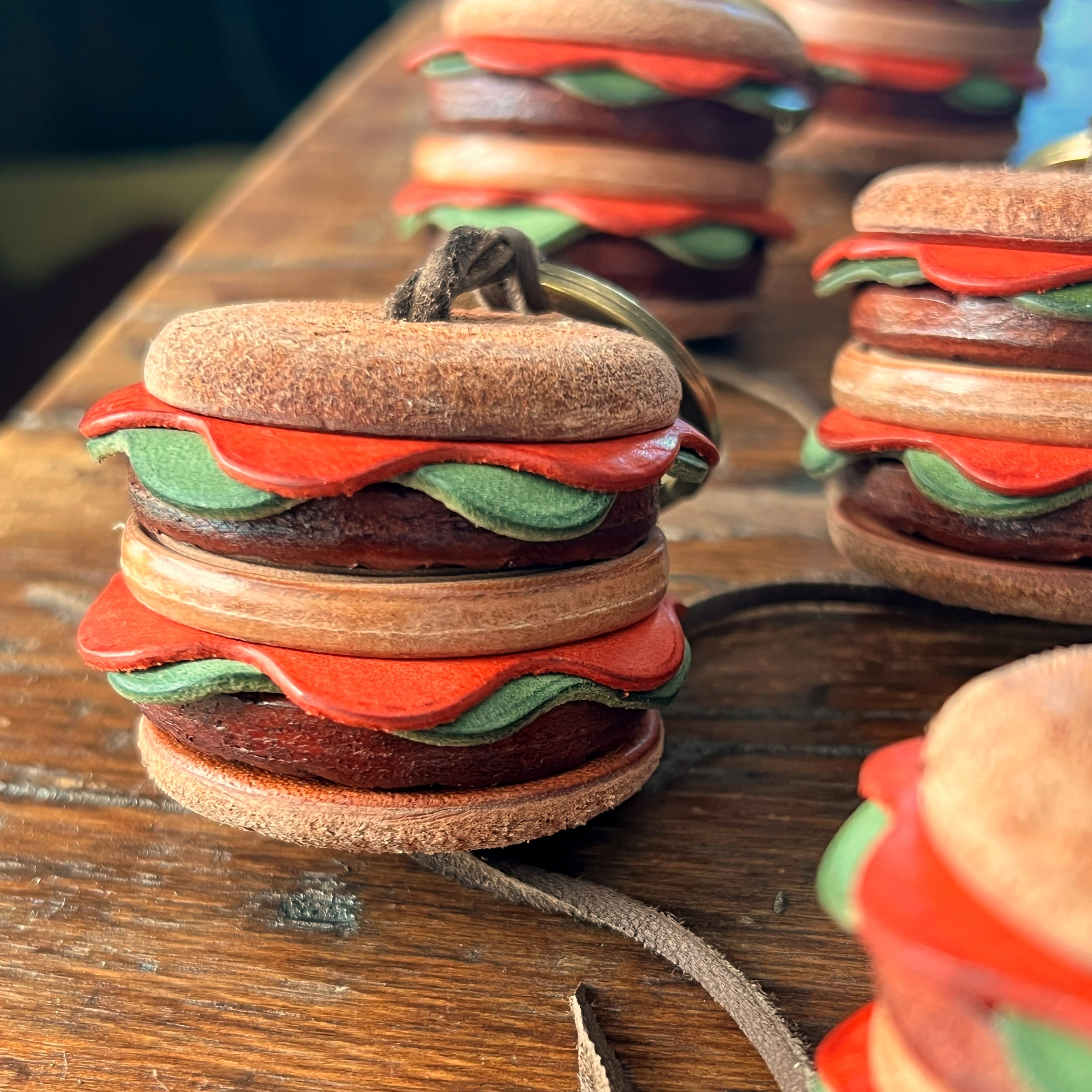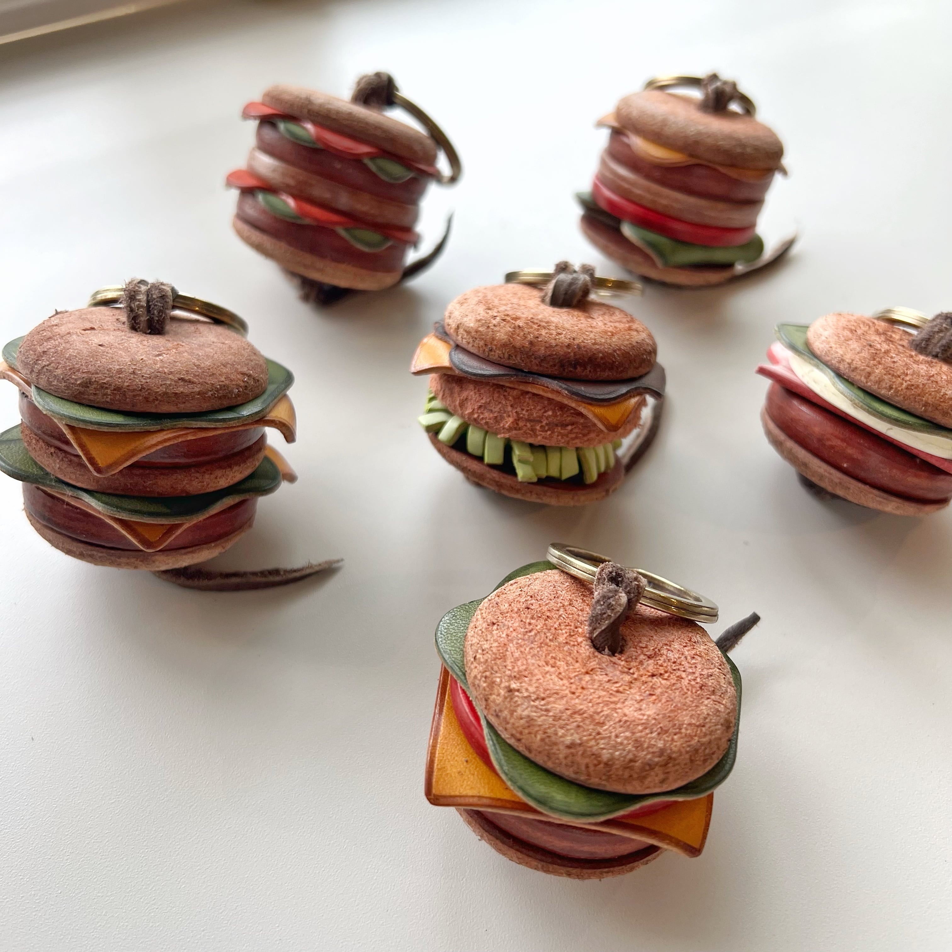バンズは極厚6~7mmの革をサークル状に切り出して一つ一つ形を削り出しています。トマト、チーズ、パティ、レタス...etc全ての素材に拘りを詰め込んで製作しました。一つ一つに使われている革はどれも選りすぐりの高級レザーを使用しています。リアリティの中に愛らしさがあります。