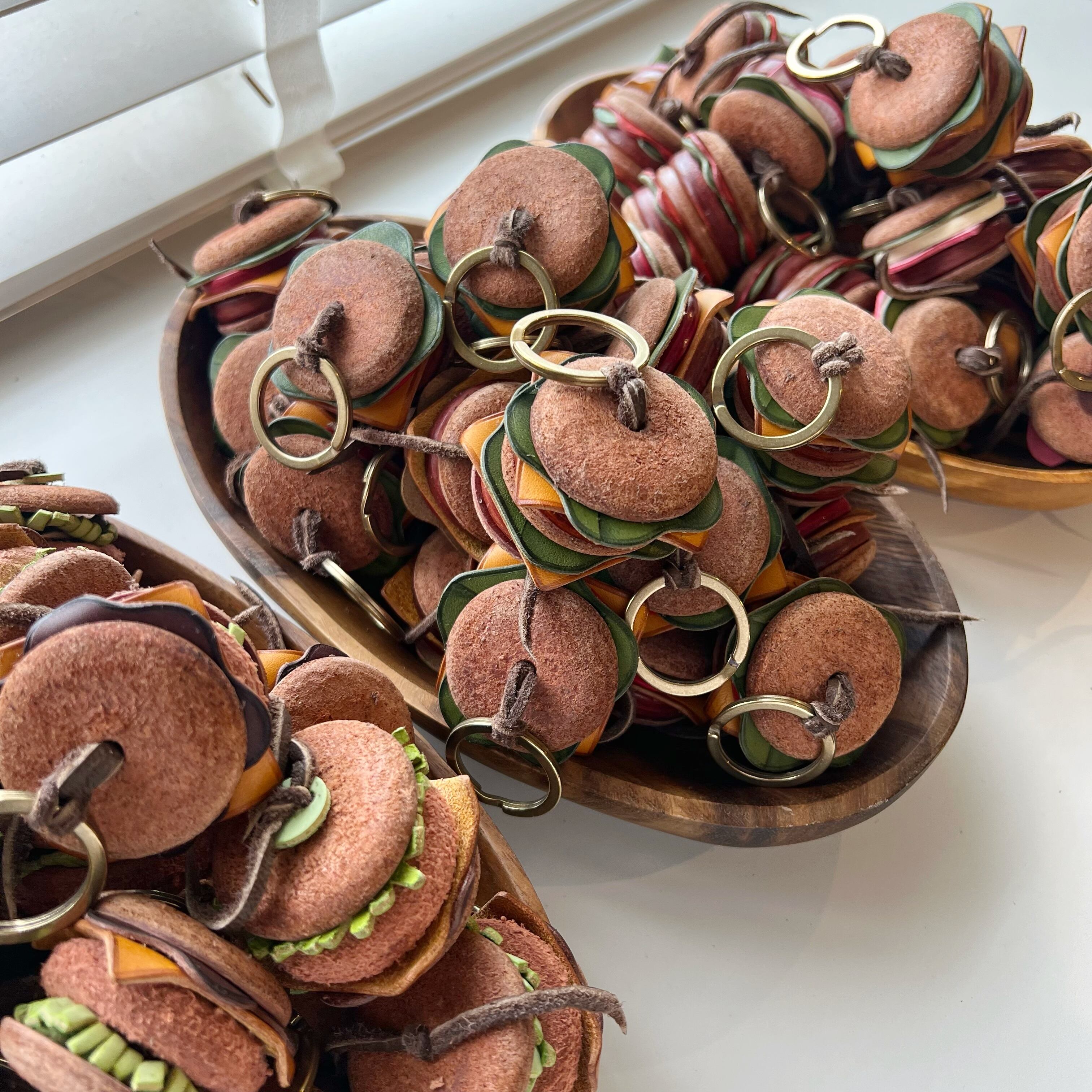 上部には真鍮製の二重リングを付けてありますので、ぶら下げるとゆらゆら揺れるかわいいキーホルダーとしてお使い頂ける上に、下部の結びを解けば全て分解出来ますので、順番を入れ替えて遊んだり、ディスプレイしたりすることも可能です。お好きな順番に組み替えてオリジナルレザーバーガーにしてください♪