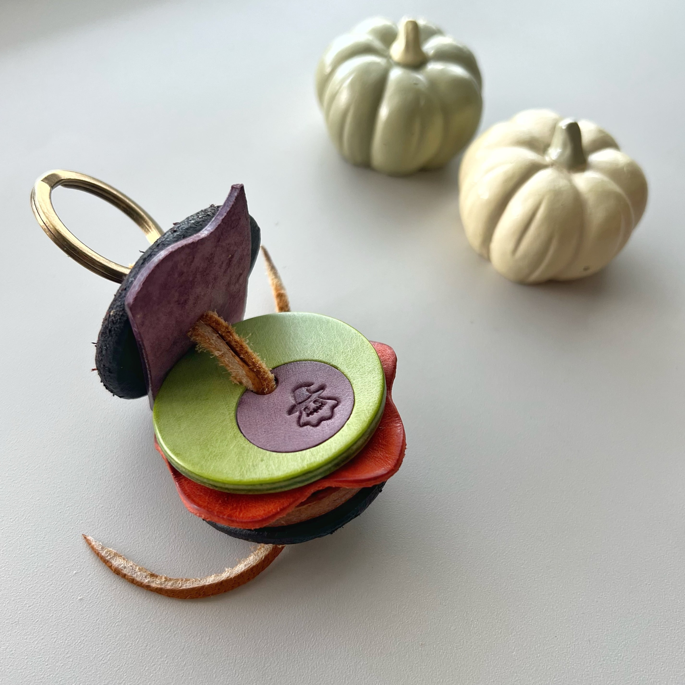 レザーバーガーは上部に真鍮製の二重リングを付けてありますので、ぶら下げるとゆらゆら揺れるかわいいキーホルダーとしてお使い頂ける上に、下部の結びを解けば全て分解出来ますので、順番を入れ替えて遊んだり、紐を外してディスプレイしたりすることも可能です。