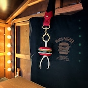 レザーバーガーは上部に真鍮製の二重リングを付けてありますので、ぶら下げるとゆらゆら揺れるかわいいキーホルダーとしてお使い頂ける上に、下部の結びを解けば全て分解出来ますので、順番を入れ替えて遊んだり、紐を外してディスプレイしたりすることも可能です。