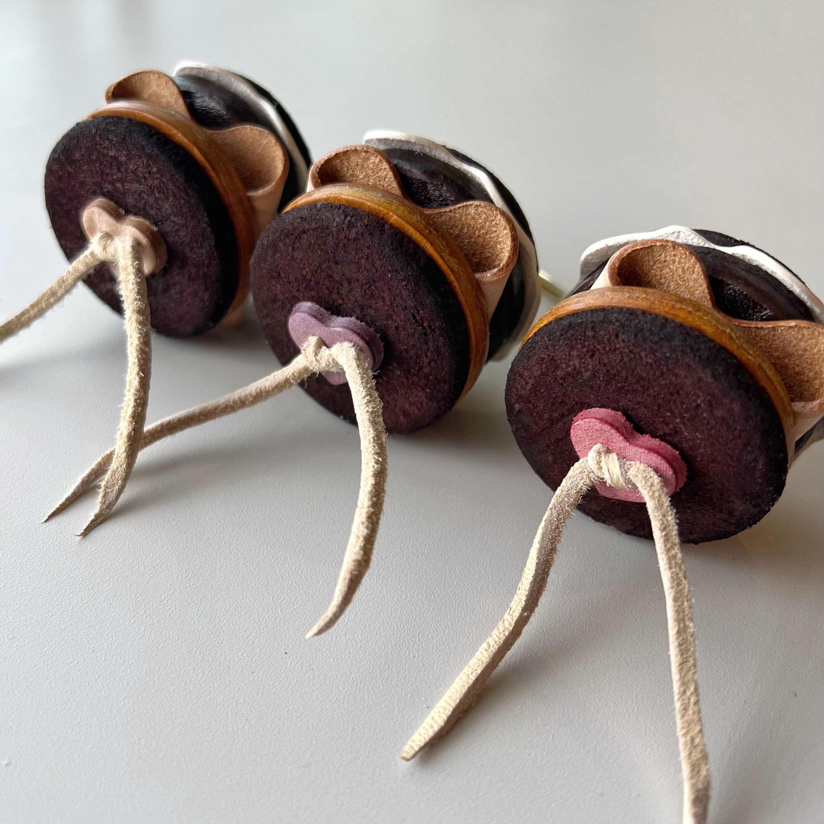 上部には真鍮製の二重リングを付けてありますので、ぶら下げるとゆらゆら揺れるかわいいキーホルダーとしてお使い頂ける上に、下部の結びを解けば全て分解出来ますので、順番を入れ替えて遊んだり、紐を外してディスプレイしたりすることも可能です。