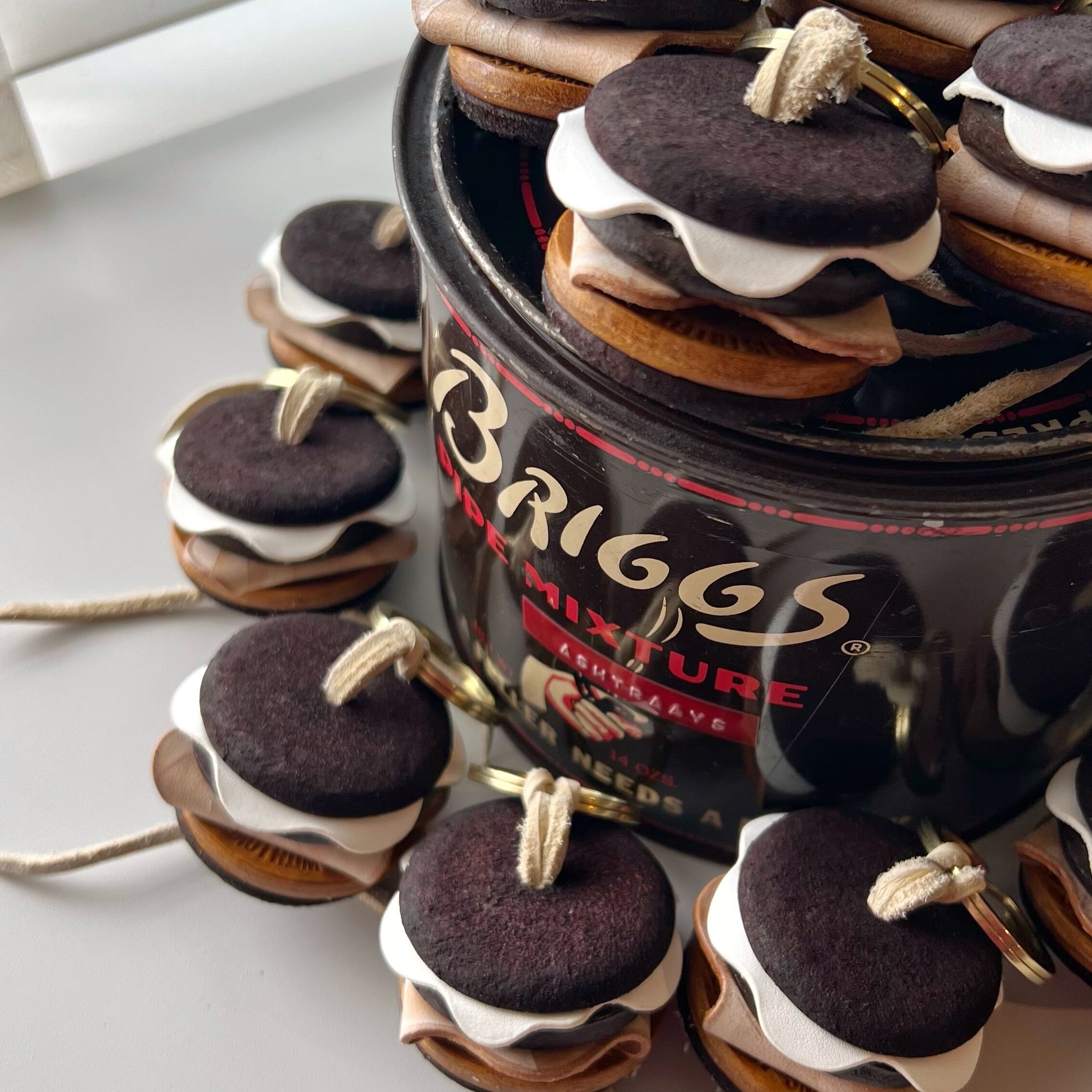 バンズは極厚6~7mmの革をサークル状に切り出して一つ一つ形を削り出しています。トマト、チーズ、パティ、レタス...etc全ての素材に拘りを詰め込んで製作しました。一つ一つに使われている革はどれも選りすぐりの高級イタリアンレザーを使用しています。リアリティの中に愛らしさがあります。