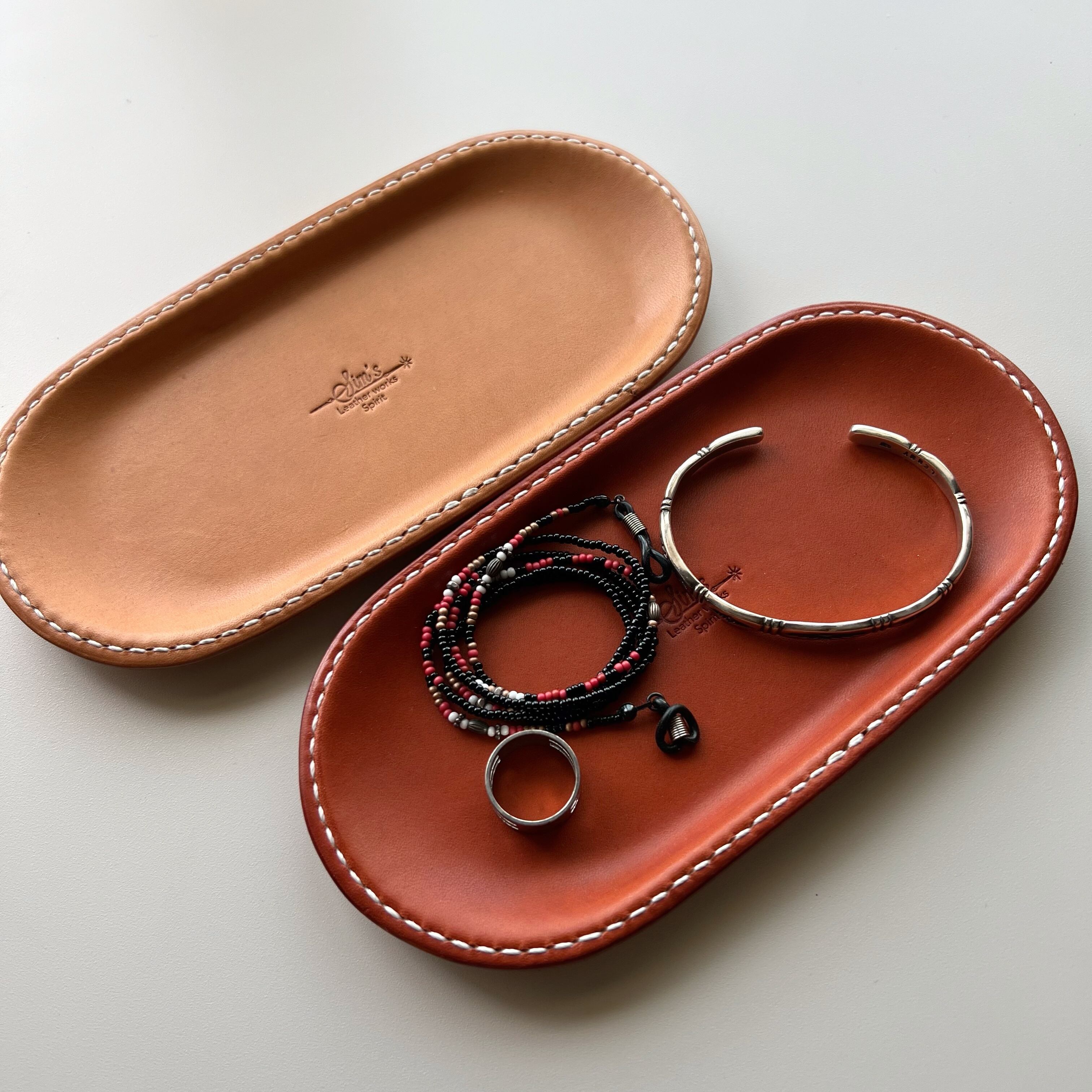 ピアスやアクセサリーを置いたり、小物、筆記具など、革の存在感がインテリアにあるだけで一気にオシャレな空間になります。