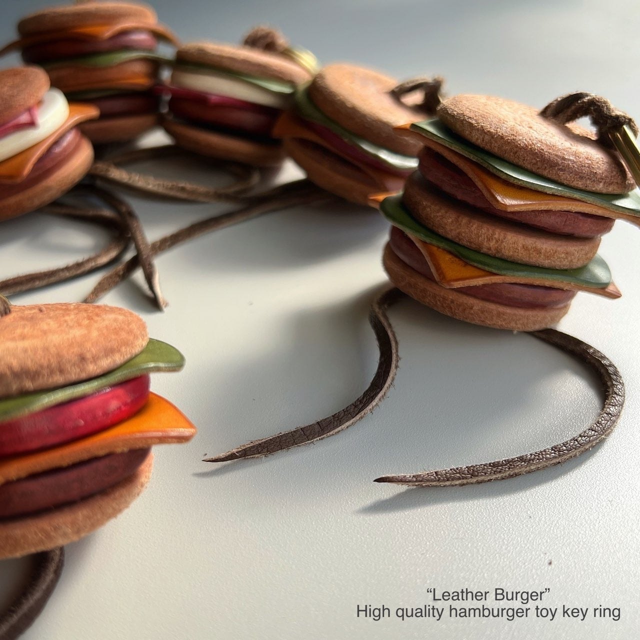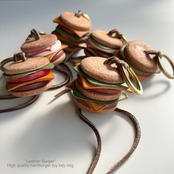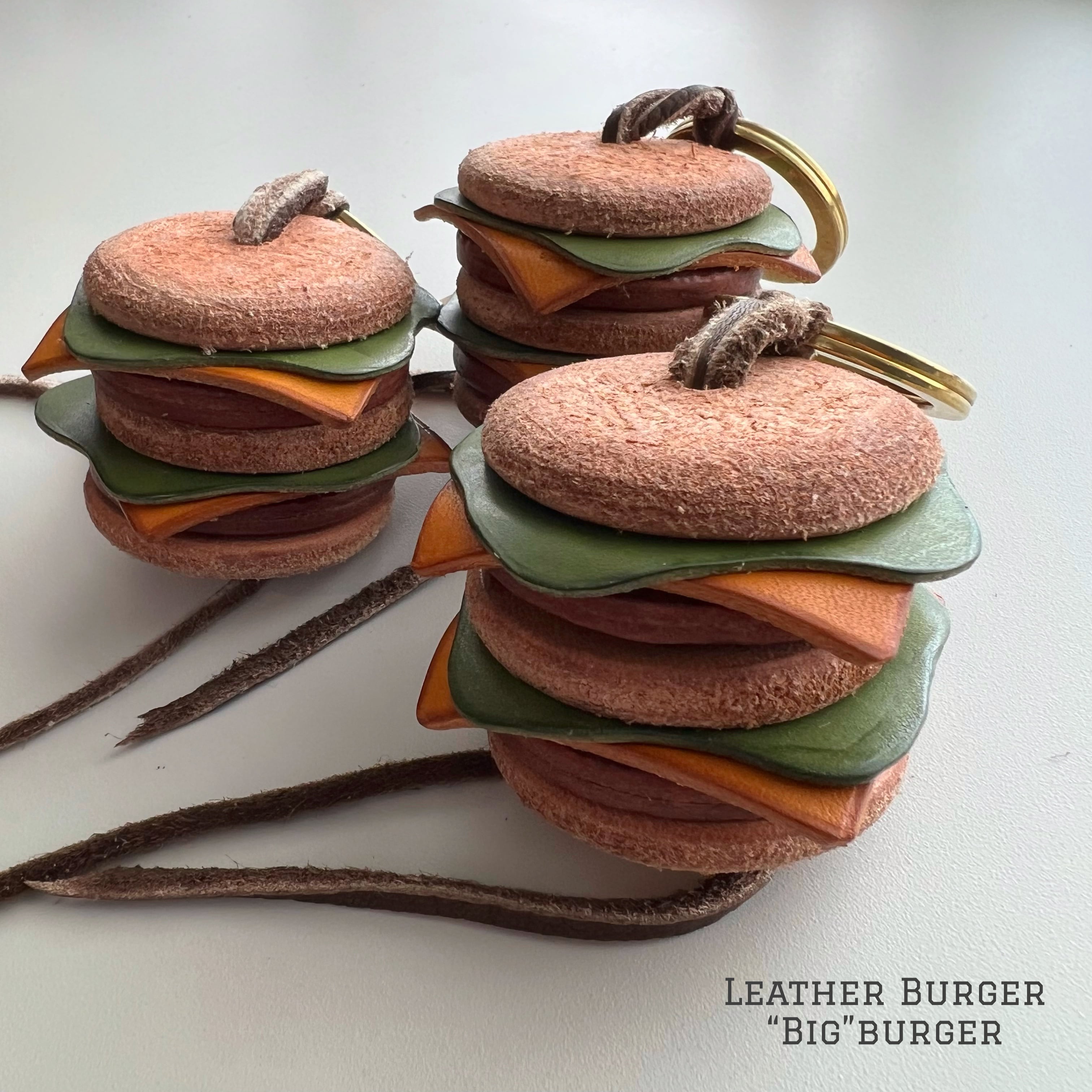 上部には真鍮製の二重リングを付けてありますので、ぶら下げるとゆらゆら揺れるかわいいキーホルダーとしてお使い頂ける上に、下部の結びを解けば全て分解出来ますので、順番を入れ替えて遊んだり、ディスプレイしたりすることも可能です。お好きな順番に組み替えてオリジナルレザーバーガーにしてください♪