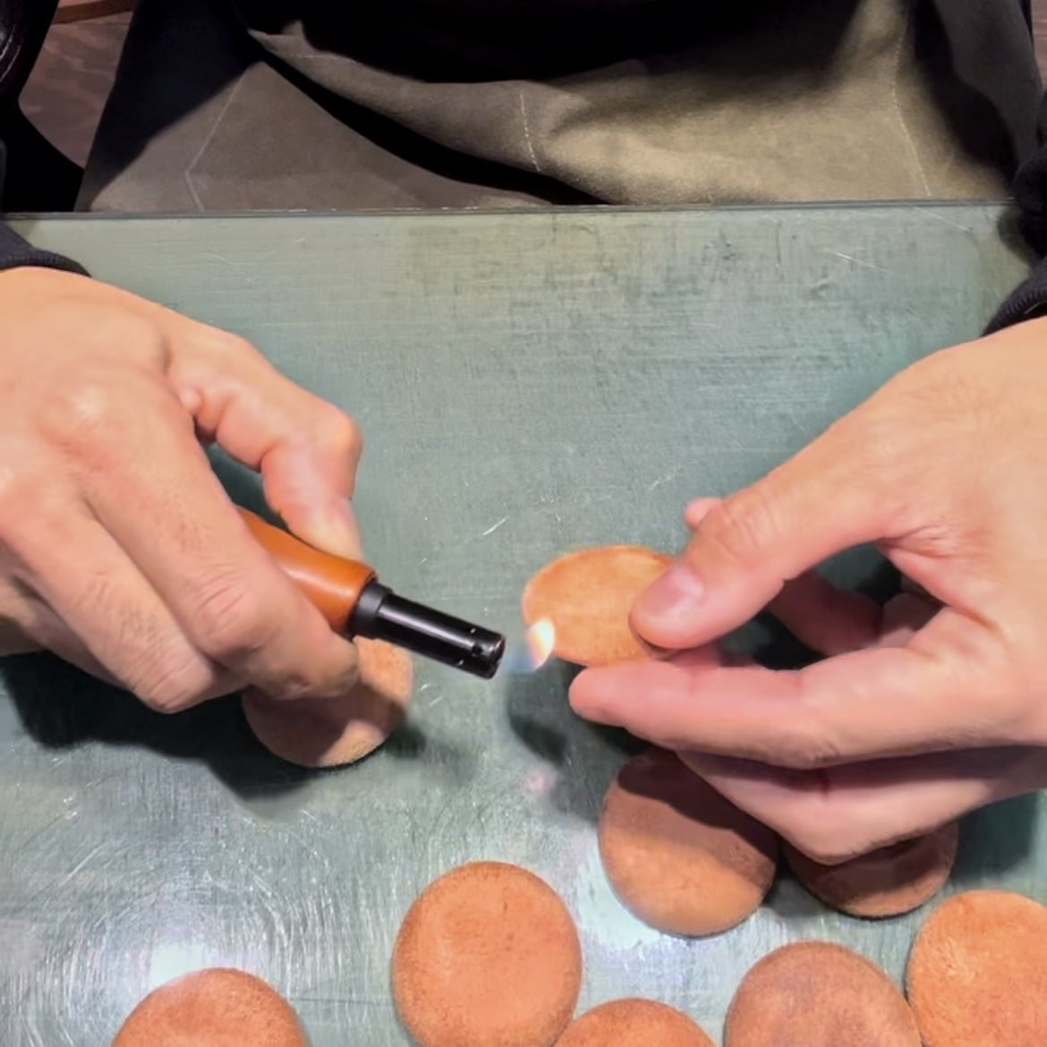 バンズは極厚7mmの革をサークル状に切り出して一つ一つ形を削り出しています。トマト、チーズ、パティ、レタス...etc全ての素材に拘りを詰め込んで製作しました。一つ一つに使われている革はどれも選りすぐりの高級レザーを使用しています。リアリティの中に愛らしさがあります。