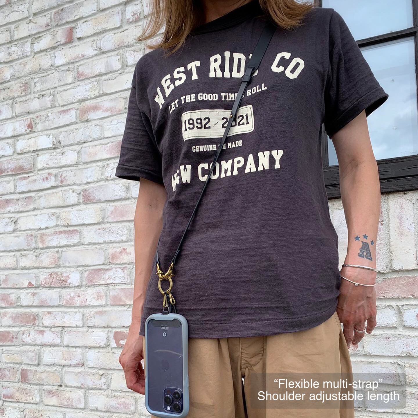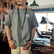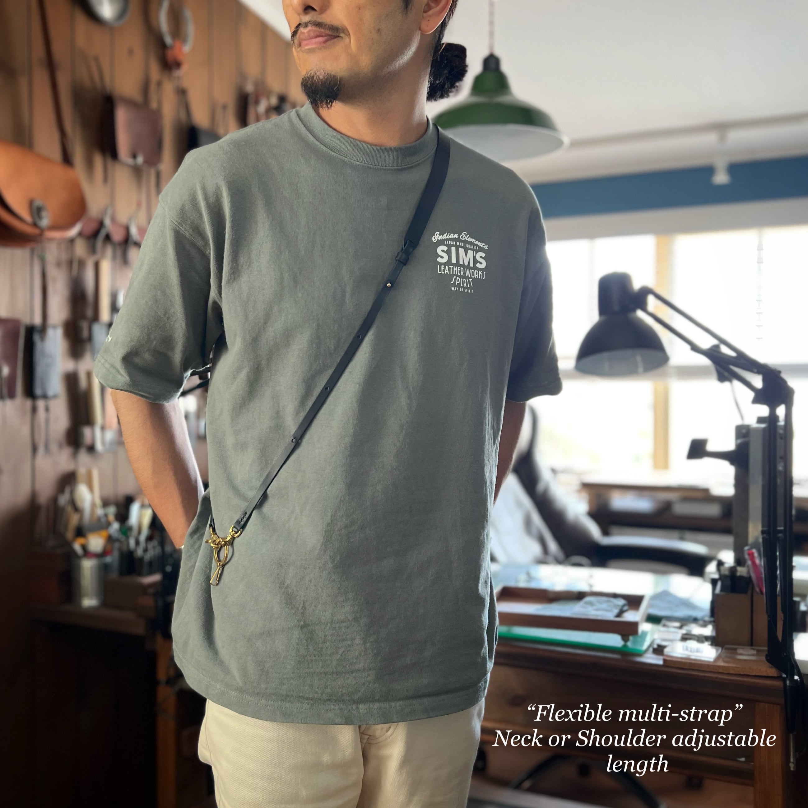 長さは約110cm〜135cmに調節可能。ギボシで留めるだけなので、ゴツい印象にはなりません。また、前後共に調節出来るので、前後対称の長さに揃えることももちろん、前後で変えることで110~135cmの間で細かな長さ調節も可能です。